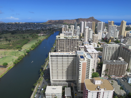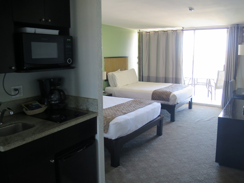 二度目の利用ですが、「パノラミック オーシャンビュー」指定で予約したら、最上階で、ラナイからはワイキキビーチ、ダイヤモンドヘッド、アラモアナ運河まで見渡せる超絶景の部屋でした。バスルームは狭かったですが、簡易キッチンには電子レンジ、冷蔵庫、コーヒーメーカー、包丁、まな板、食器、トースター、炊飯器なども用意されていて、とても快適な滞在でした。