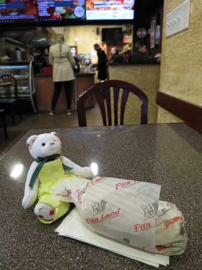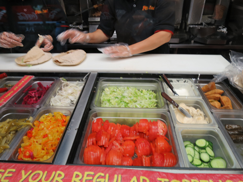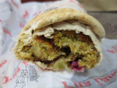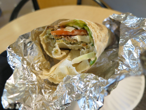 私はファラフェル(豆をすりつぶしたコロッケ)のラップサンドを注文しましたが、トッピングする野菜はキャベツ、玉ねぎ、チリなど数種類あり、リクエストに応じて抜いたり量を増やしたりすることができました。野菜にかかっているとろりと濃厚なタヒーナ(ゴマのペースト)の風味が口いっぱいに広がっておいしかったです。