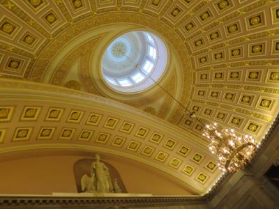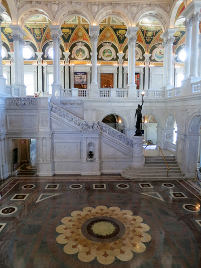 議会図書館はトーマス・ジェファソン館、アダムス館、ジェームス・マディソン記念館の3つの建物から構成されています。その中で最も美しいと言われるトーマス・ジェファソン館を見学しましたが、優美な柱と装飾画に彩られた非常に美しい空間が広がっていました。天井画など室内の説明はタッチパネルを使ってわかりやすく解説されています。また二階から見下ろす円形閲覧室は映画のセットのようで、こんな所で一日中、本に囲まれていたら幸せだろうなと思いました。尚、円形閲覧室は写真撮影NGです。でも、係員の目を盗んで撮影している人が何人もいました。