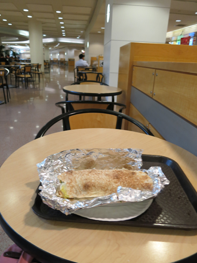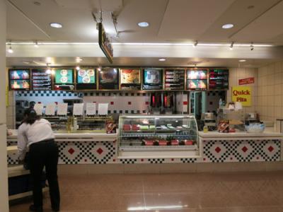 フードコートにはサブウェイやお寿司、中華などのファーストフード店が並んでいましたが、11時半と少しお昼時には早かったせいか空いていました。私は「Quick pita」という店でファラフェルのラップサンド(6.6ドル)を食べました。ピタパンは温め方が足りず、ちょっと冷たかったですが、レタスやトマトなどの野菜とゴマのペースト「タヒーナ」がとてもおいしかったです。- 旅行時期