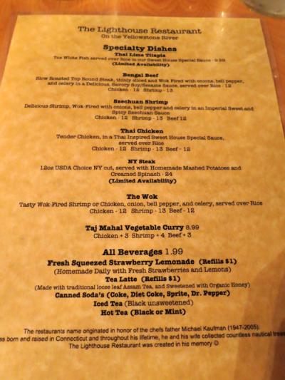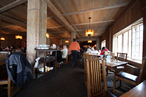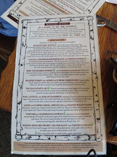 イエローストーン国立公園内のホテル「オールド・ フェイスフル・イン」の中にあるレストランです。オールド・ フェイスフル・インの山小屋風のロビーの奥にあり、雰囲気も良かったです。レストランは朝は6時半から10時、ランチは11時半から14時半、夕食は17時から22時まで営業しているようです。混みあうので夕食は事前に予約しておいたほうが良いようですが、ランチで利用した際は予約なしでも入れました。