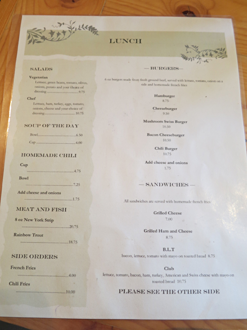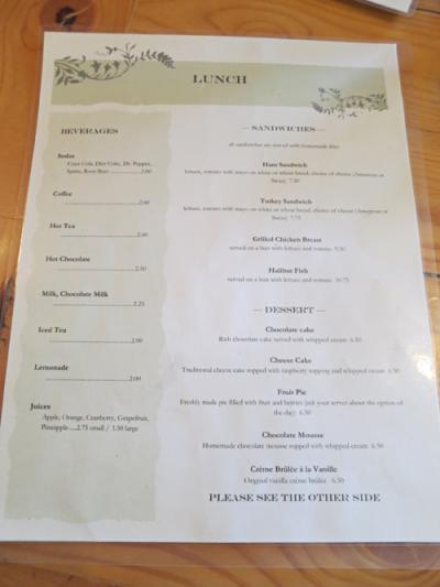 メニューはハンガーバーやサンドイッチがメインで、値段は8.75ドルから10.75ドルくらいでした。また、デザートはチョコケーキ、チーズケーキ、フルーツパイ、チョコムース、クリームブリュレなどがありました。