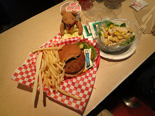 私たちが注文したのは「黒豆バーガー(Blackbean burger、8.4ドル)」、「チキン シーザー サラダ(Chicken ceaser salada、9.25ドル)」、「ワイルダーネス チリ(Wilderness chili、5.3ドル)」。