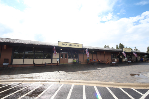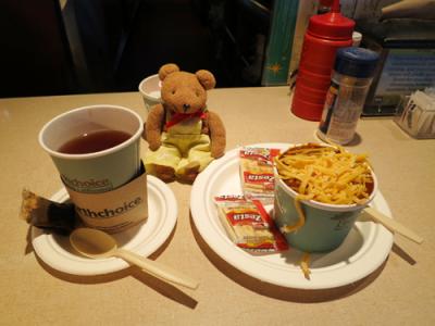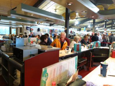 イエローストーン国立公園のキャニオン・ロッジにあるカフェテリアです。周辺にはレストランなどもありますが、昼食時はどこも混んでいて、このカフェにも長蛇の列ができていました。すぐ隣りは土産物を扱うショップなので、店内は騒がしいですが、その分、回転が早いので、思っていたよりも待たずにすみました。