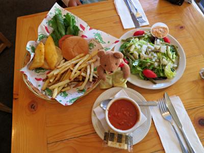 私たちは「ヒラメのサンドイッチ(Halibut fish sandwitch、10.75ドル)」と「ホームメイド チリ(Homemade chilli、4.75ドル)」と「ベジタリアン サラダ(Vegetarian salada、9.75ドル)」を各一皿頼んで、二人でシェアしました。