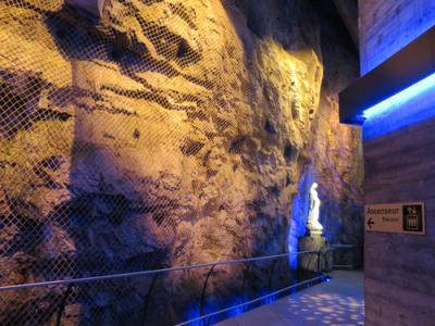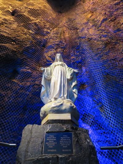 病気、特に不自由な足がよくなるということで、毎年200万人以上の人々が訪れる聖地だそうです。この礼拝堂で私が特に感銘を受けたのは、一階のエレベーター乗り場の前にある大きな岩とマリア像です。この岩からしみ出す水を見ていたら、フランスの聖地ルルドの聖水が湧き出る洞窟を思い出しました。岩自体からも強い力が発せられているような冒しがたい雰囲気が漂ってきていて、思わず膝まづいて祈りたくなりました。