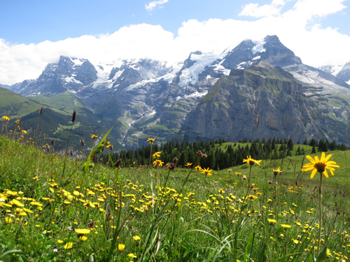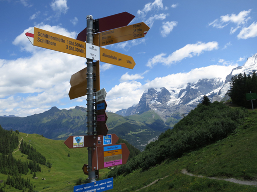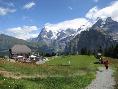 グリュッチアルプからミューレンまでトレッキングするつもりが、気づけばアルメントフーベルまで歩いてしまいました(所要2時間半くらい)。表示を確認しながら歩いていたつもりですが、わかりづらい箇所もあったのでトレッキングを予定している方は事前に地図でよく調べておいたほうがいいと思います。グリュッチアルプからアルメントフーベルへは登り坂が多く、逆ルートで歩くと下り坂が多い道のりになります。アルメントフーベルは、ケーブルカー乗り場のすぐ近くに花畑のような可憐な景色の向こうに雄大な山々が聳え立つ気持ちよい場所なので、ケーブルカーを降りて周辺を歩くだけでも楽しいと思います。