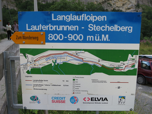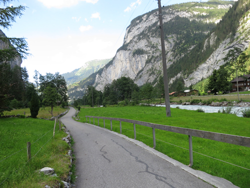 シュテッヒェルベルク 駅からバスに乗るつもりが、30分に1本しかなくて、そのバスがちょうど目の前で行ってしまったのでラウターブルンネンまで歩くことにしました。すぐそばで見あげる岩山は迫ってくるようで迫力があり、轟々とうなるような川の水音がうるさいほどでした。