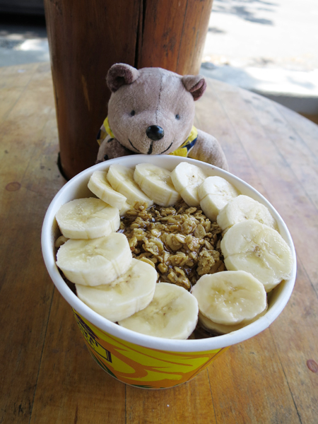 お店はバス通りに面した所にあり、すぐに見つかりました。テラス席もあって、ちょっと休憩するのに良い場所だと思います。アサイーボウル(値段は6.81ドル)は、バナナとグラノーラとハチミツがたっぷりで、かなりのボリュームでした。他店で食べたアサイーは味がしませんでしたが、ここのはしっかり味わえました。ただ、カップの底のへいくほど味が薄くなりました…。