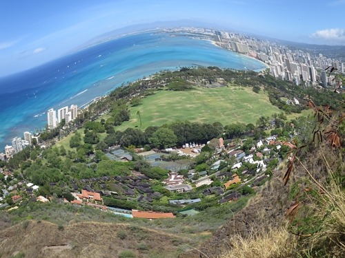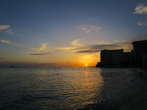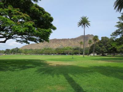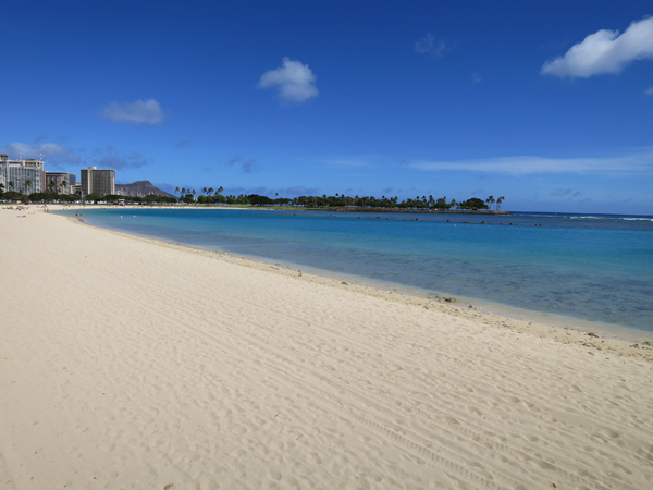 ワイキキビーチはいつもすごい人ですが、少し離れたこの場所は人も少なく、水の透明度も高くて、私はこちらのほうが落ちついてくつろげるので気に入っています。また、景色も良いせいか、結婚の記念撮影場所としてもよく使われていて、ウエディングドレス姿の花嫁さんを見かけました。