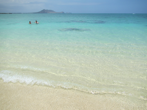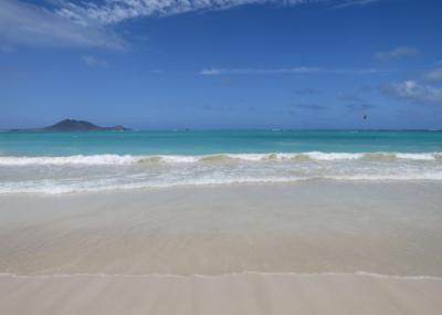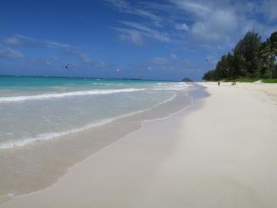 駐車場からすぐのビーチは人も多く混んでいましたが、カイルアタウン寄りの少し離れた所はほとんど人もいなくて、砂浜に足跡もなく、すごく美しい眺めを楽しむことができました。カイルアタウンからは歩いていきましたが、ビーチへ向かうバスは本数が少ないです。歩いたほうが早いだろうと思ったのですが、途中、雨宿りする場所もないような所で土砂降りになり慌てました。通常、雨季は3月だそうですが、その年の気候によって4月もまだ雨季が続いていることもあるようです。
