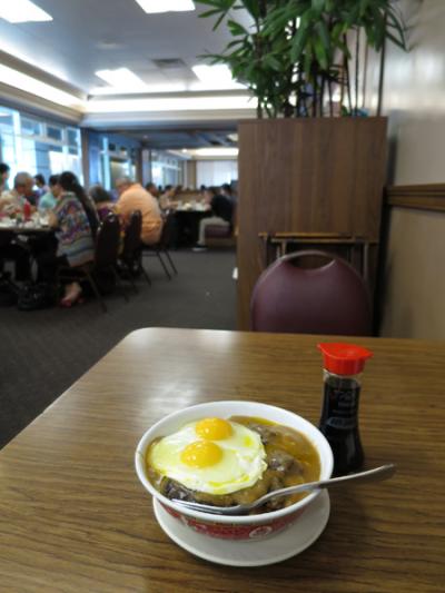 お昼前の11時頃に行きましたが、店内はかなり混んでいました。ロコモコ(値段は11.26ドル)は、ラーメンを入れるような中華どんぶりに入っていて、すぐ横には○マサの醤油が添えられていました。量が多くて、途中で飽きてきましたが、醤油をたらしたら味が変わって口直しになり良かったです。しかし、食器や店内を見ていると、なんだかハワイではなく中華料理の店に入ったような感じでした。
