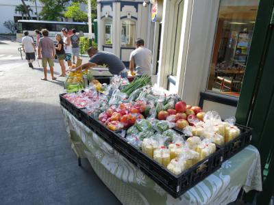 毎週木曜日に開催されるファーマーズマーケットは、すごい人出で前に進むのも大変でした。でも、名物のハチミツや、コーヒー、手作りパンなどの試食もあり、あれもこれも買いたくなります。また、時々、キャンペーンで無料で小物を配っていたりします。私はスオッチのネームタグをもらいました。時間があればのぞいてみると、意外な掘り出し物に出会えるかもしれません。