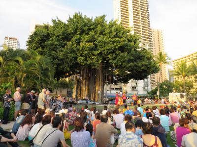 4月は19時頃が日没なので、夕日に染まる海とフラショーを楽しめて2倍得した気分になれました。ただ私は後ろのほうで立って見ていたのですが、座って見る人たちのスペースの後ろのほうは人の出入りがあり、目の前を人が行ったり来たりされると、フラを見るのにけっこう気になります。じっくり見たい人は早めに場所取りして前のほうに座ったほうがいいかもしれません。