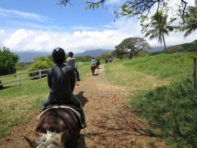 ワイキキに着いてから現地の旅行会社を通してアクティビティを2つ体験できる半日ツアーに申し込みました。7時にワイキキのホテルから送迎バスに乗り、8時半に牧場に到着。すぐに乗馬に参加したかったのですが、人気のアクティビティのため希望者が多く、時間は牧場側から指定されます。私は9時15分にオーシャン ボヤージュに参加し、その後、11時15分に乗馬、12時15分に昼食、13時にはワイキキに戻るバスに乗るという、けっこうハードなスケジュールでした。乗馬は10人くらいが1グループとなって係の人に先導されて牧場内を歩きますが、景色がとても素晴らしかったです。馬もよく訓練されていて、ひとりで手綱を握って馬に乗るのが初めての私でもおとなしく言うことを聞いてくれて楽しかったです。オーシャン ボヤージュもすごくスリルがあってサイコーでした! ぜひまた他のアクティビティにも参加してみたいです。