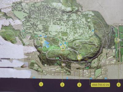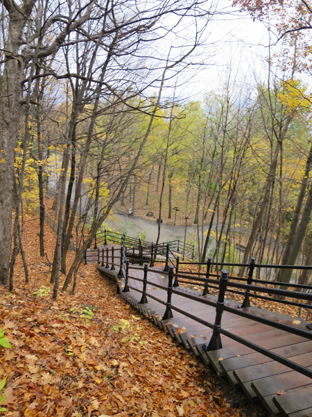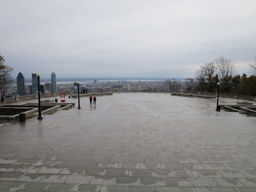 マギル大学のレッドパス博物館を見た後、Peel通りを北へ上っていくと、モンロワイヤル公園の入口に出ます。表示に沿って階段を登っていくと、シャレー・ド・ラ・モンターニュ前の展望台に出ました。所要時間は約20分。あいにく曇っていて寒い日でしたが、目の前に広がるモントリオールの町は素晴らしかったです。シャレー・ド・ラ・モンターニュの中には休憩所やトイレ、インフォメーションもあり、公園の地図を入手できたり、他の展望場所への行き方も教えてくれました。