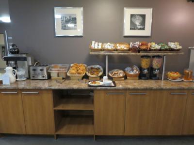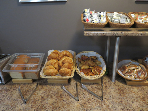 朝食はコンチネンタルビュッフェで、パン、ベーグル、マフィン、カマンベールチーズ、キューブ型のツナ、日替わりでキッシュやベイクド・ビーンズなどが並んでいて、おなかいっぱいになりました。- 旅行時期