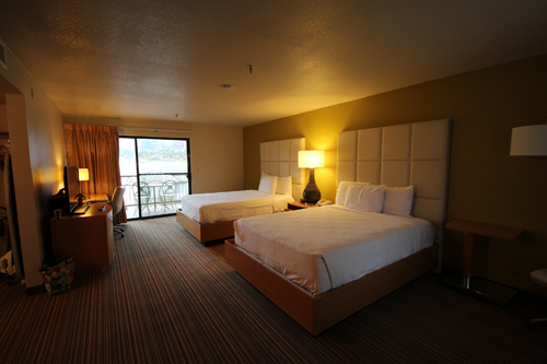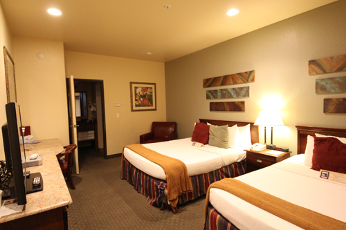 レッドロックの景色を望む専用テラス付きのデラックス クイーンルームに2泊しました。部屋はとても広くて、改装されたばかりらしくペンキの臭いがしたり、ベッドには商品タグがついたまま、入口のドアはカーペットに引っかかって力を入れて押さないと閉まらないという設計ミスもありましたが、それもご愛嬌と笑ってしまいました。