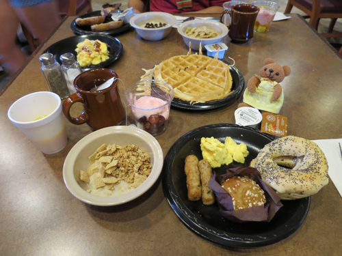 朝食は各種ベーグル、カップケーキ、自分で焼くワッフル、スクランブルエッグ、ソーセージ、温かいオートミール、カットフルーツ、ヨーグルト、ジュース、コーヒー、紅茶にハーブティーなど、おなかいっぱいになりました。次々に補充してくれるので、食べ損ねることはありません。- 旅行時期