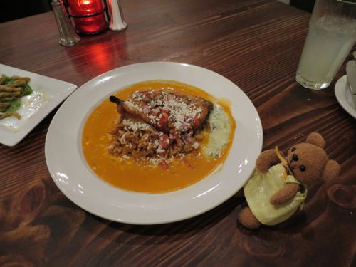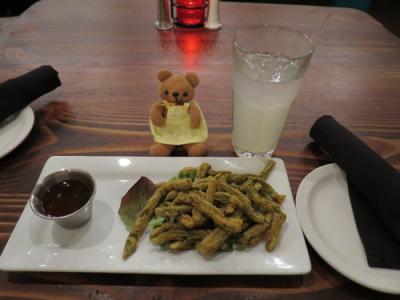 注文したのは、この店のスペシャルメニューだという「Chile Relleno Poblano(13.95ドル。グリーンチリにチーズを挟んでフライにしたものに、トマト風味のカルボナーラソースみたいなものがかかっていて、どこか懐かしい味)」と「Cactus fries(7.95ドル。サボテンのフライ。味は酸味とスパイスが混じりあい、衣のサクサク感とあいまって、こちらもおいしかったです)」。