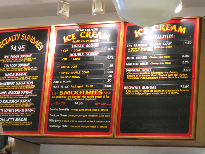 自家製アイスのお店ですが、メニューにはサンデーやバナナ・スプリットなどもありました。また特製メニューとして「自家製バニラアイスとドラフト・ルート・ビア」などという変り種も。