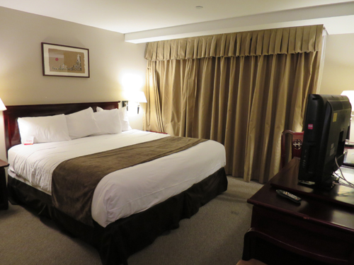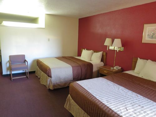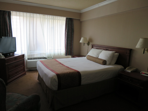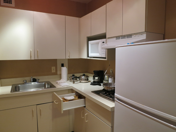 部屋は多少、古ぼけた感じはありますが、二人で泊まるには十分なスペースがありました。すぐ目の前に大型スーパーsafewayがあるので、そこで買ってきたものを部屋にある冷蔵庫に入れたり、電子レンジで温められたりして便利でした。バスルームにはシャワーとバスタブもありました。