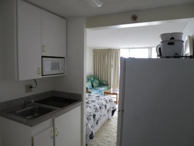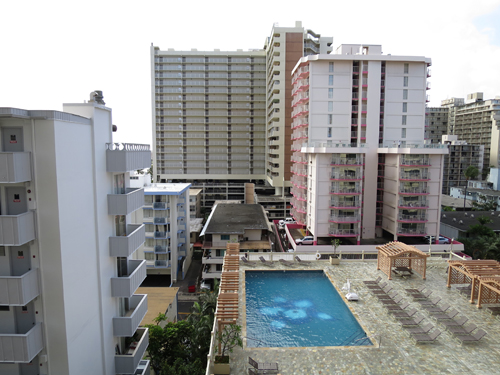 ホノルル中心部で、そこそこ値段が手ごろで、高層階からの眺めが楽しめるコンドミニアムということで、ここに決めました。立地は素晴らしく、ビーチへ行くにも、買い物へ行くにも便利でした。日が沈んでから徒歩で戻っても、人通りのある大通りを通れば治安的に不安になることはありませんでした(ホテルのすぐ前の通りは、人通りが少ないので、早足で駆け抜けましたが…)。