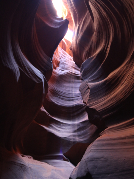 アッパーアンテロープはペイジ発のツアーで、ロウアーアンテロープキャニオンは直接、現地に行ってツアーに参加しました。ロウアーはどの時間帯でも美しいと言いますが、アッパーのほうは正午前後の時間帯がちょうど真上から光が射し込み綺麗に見えます。