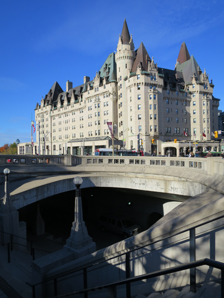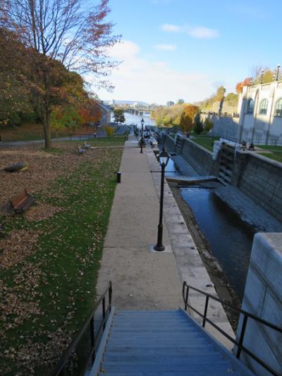 10月末頃に行ったら紅葉は終わりかけでしたが、まだ何本かは綺麗に色づいていました。ホテル ザ フェアモント シャトー ローリエ前の階段を下って、右手に運河を見下ろしながらウタウエ川へと歩いていったら、パーラメント・ヒルを見あげながら川沿いに伸びる遊歩道になっていました。