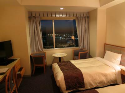 JAL楽パックの「45階以上確約プラン」で一泊しました。スタンダードシングルを予約していたのですが、スタンダードツインに無料アップグレードしていただきました。フロントの方の対応も親切で、海側と市街地側のどちらが眺めが良いか尋ねると、海側のほうが人気とのこと。ただ左右に高層ビルが建ってしまって以前のように眺めを遮るもののない景色は楽しめなくなったそうです。それでも、45階以上の部屋だと気にならないと言われ、47階の海側の部屋に泊まりました。