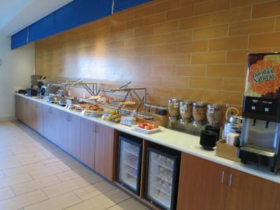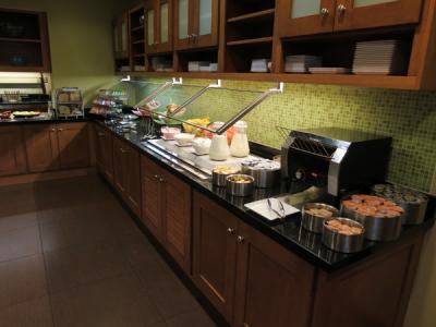 朝食はビュッフェ形式で食パン、ベーグル、スクランブルエッグ、ドーナツ、ワッフル、コーンフレーク、ヨーグルトにリンゴなどがありました。食事できる場所は狭いので、急ぐ場合は早めに行ったほうがいいかもしれません。またレセプションの外にもテーブルがあり、その近くにマフィンやポットに入ったコーヒー、レンジなども用意されていました。- 旅行時期