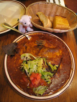 「エンチラーダ(9.75ドル)」はレッドチリ入りトマトソースの下にブルーコーンのトルティーヤが2個も隠れていて、すごいボリューム。一皿を二人でシェアするのが良いと思います。