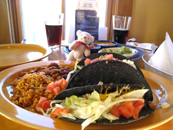サンタフェの中心地プラザから少し歩いたWater通りにあるカフェ & 醸造所です。ここでは、ニューメキシコ料理が食べられます。店員さんのおすすめは「地ビール」と「ブルーコーンタコス」。ブルーコーンとは、紫色っぽいとうもろこしの粉から作られたもの、タコスの具はチキンか豚肉か選べます。ほっくりと煮込まれた金時のような豆とライスが付け合せについて9.75ドル。