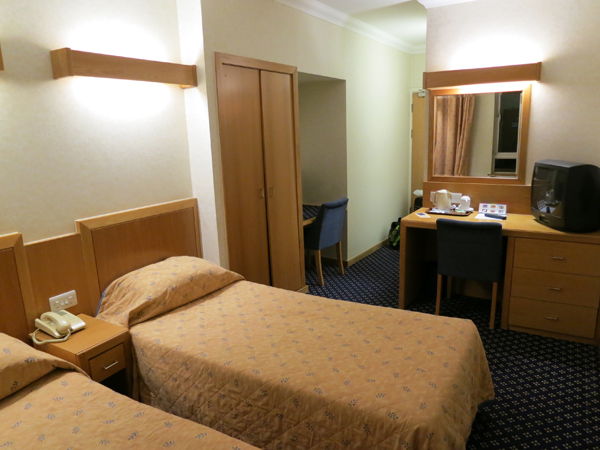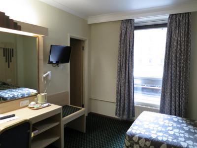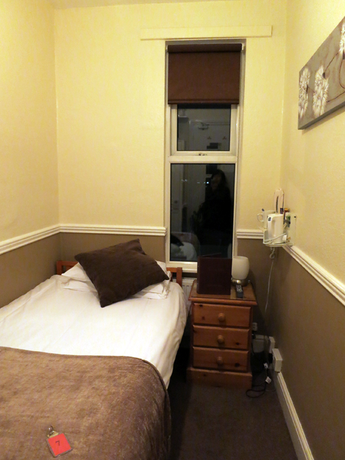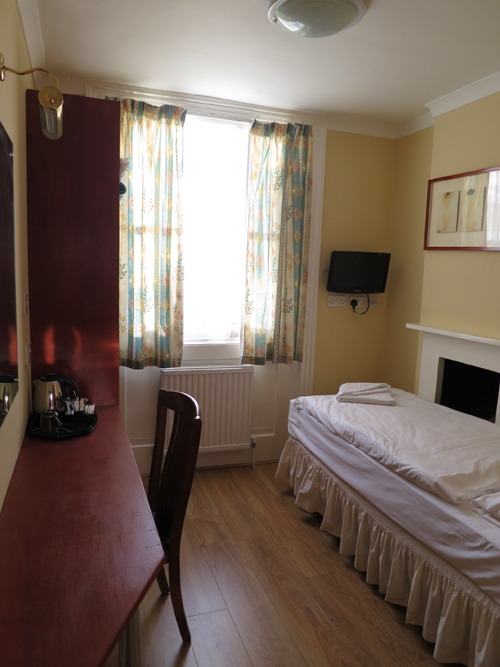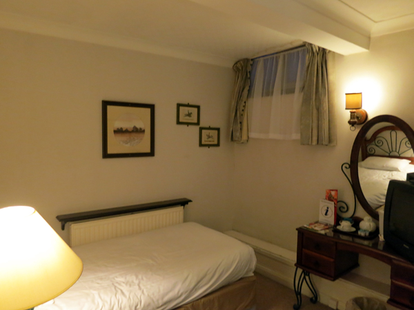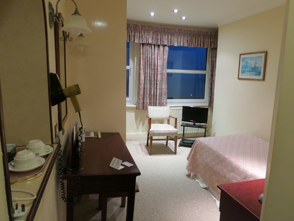 まず、最上階のシングルは、大通りとは反対側で騒音もなく静かでしたが、すごく狭かったです。洗面台も小さく、洗濯などする際には非常に使いづらいです。でも、これはこのホテルに限らず、イギリスにはよくあることなので仕方ないとあきらめるしかありません。他にも設備が古くて、シャワーヘッドを置く部分が壊れていたり、トイレがガタついたりしましたが、一泊フルイングリッシュ・ブレックファースト付きで5000円ちょっとで泊まれたので十分満足と思いました。