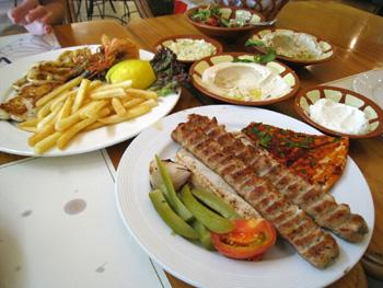 前菜は「タブーレ(ミント、パセリ、トマト、玉ねぎをオリーブオイルで合えたサラダ)」、「ホンモス(ヒヨコ豆のペースト)」、「ババガンヌーン(ナスとヨーグルトのペースト)」に焼きたてのホブス(アラビアのパン)。