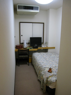 禁煙シングルルームに泊まりました。部屋の照明が暗めでしたが、寝るだけだったので気になりませんでした。朝食は、食パンとロールパンとキャベツとソーセージとコーヒーだけですが、駅から徒歩7分で、この値段で朝食付きというのはありがたいです。