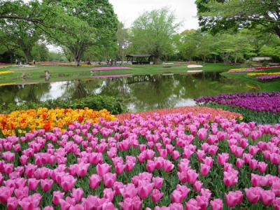 チューリップが有名なオランダのキューケンホフ公園の前園長によりデザインされた、昭和記念公園のチューリップ。渓流にかかる橋を渡り、チューリップを見ながら歩いていると、オランダにいるような錯覚に陥りました。