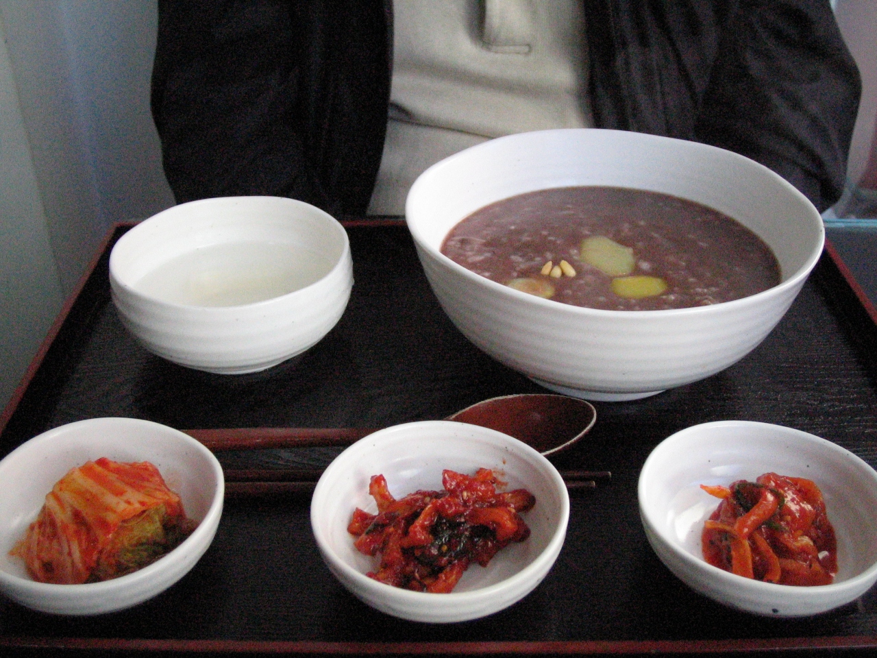 メニューも豊富で選ぶのに迷ってしまいます。私は、牛肉と野菜のお粥、夫はあずき粥を食べました。あずきの方は見た目はまるでぜんざいですが、甘くなく、食事としていただけたようです。牛肉の方は、胡麻油の香りがよく、食べ安かったです。どちらもとてもおいしかったです。あわびのお粥を食べている人も多かったです。他の飲食店同様、キムチなどのおかずが3品つきました。店内はほとんどが日本人観光客でした。