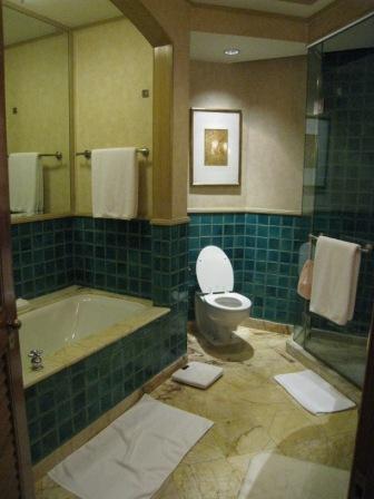 - バスタブ有。大理石と綺麗な装飾タイルが高級感ありです。シャワー水圧は弱め。