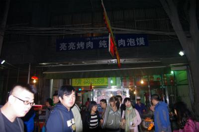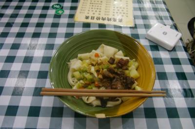 さて、本麺の有名店として回民街にある亮亮烤肉館(蓮湖区北広済街80号)の羊ビャンビャン麺を紹介します。基本的には汁なし合わせ麺で、軽い辣味の幅広麺です。1杯25元(牛麺は22元)です。量的には大碗なので十分です。西大街の市内バス広済街站下車で、北に北広済街に入り、約200m入った左側です。店の説明では本麺は秦代に首都咸陽で始められたとしていますが、回族の小吃となっている現在から見ますと、何時から始められたかはあまりはっきりしないといえましょう。なお、本店には泡馍等もあります。- 旅行時期