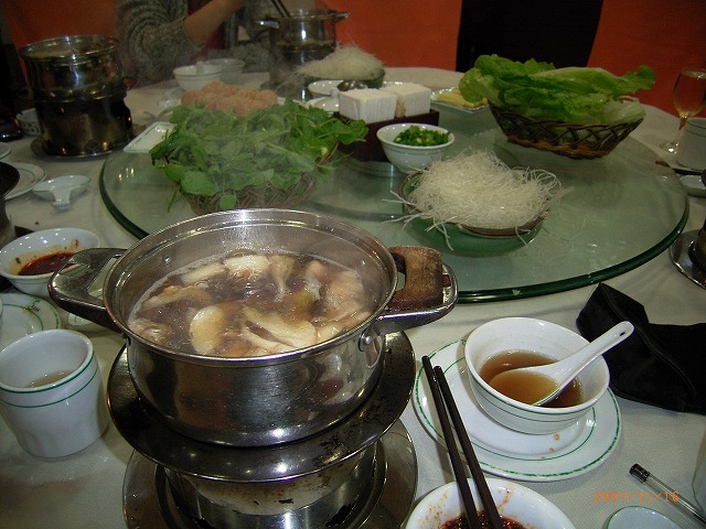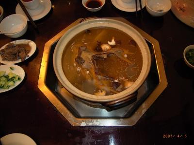 これは、鴨1羽を塩を基本としてじっくりと煮込んだ土鍋料理です。これにキノコ類を加えたのが山珍老鴨湯です。4人で一つの鍋(鴨1羽)が適量でしょう。スープを飲み、鴨肉をだいたい食べたら、野菜などの具材を加えて鍋として食します。