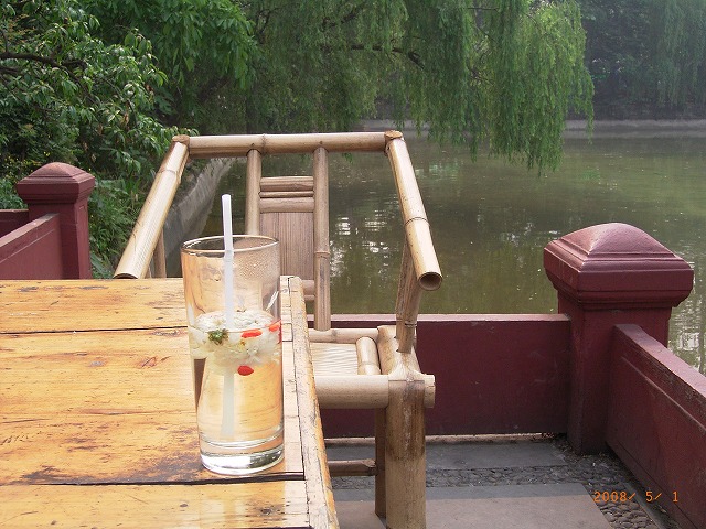 その一つとして、市中心の天府広場から西に数分の人民公園内にある「鶴鳴茶社を紹介します。本茶社は公園が1914年に拡大された際に開設されたもので90年を超す伝統ある茶館です。正大門(北門)を入り、道を左(東)に取ると直ぐです。「鶴鳴」額の建物で、注文し料金を払い、湯入りポットと茶碗(茶入り)を受け取ってから、自由に好きな場所で椅子に腰掛けて、自分で茶碗に湯を注いで、喫します。メニューは茶のみで、素毛峰(10元)から碧譚飄雪(25元)と、四川省産の緑茶を主体としたメニューとなっています。写真のは私の注文した菊花茶(10元)です。このように茶社の前面は池に面しています。この伝統の竹の椅子(四川省は竹の産地)にゆったり腰を下ろし、のんびりと時を過ごしながら、茶を喫するのはまたいいものです。また、四川人は麻雀好きで、必ずここで麻雀を打っている光景を見るでしょうし、耳垢掃除の人が声をかけてくるでしょう。