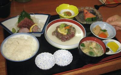 私は和食が大好きなので、お刺身と鯵のなめろうのランチセット。小鉢の煮物と漬け物デザートのスイカも付いていて1800円。量も十分で、なめろうも美味しかったし、値段も手頃のランチ。夫はビールと煮魚定食。全部の支払いは4、000円くらい。