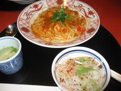 ここではスープの食器なども和風でフォークでなくお箸を使う。これも悪くはないけど、両方置いて選べるようにしたらどうかなと思う。フォークの方がパスタの場合慣れてるし。