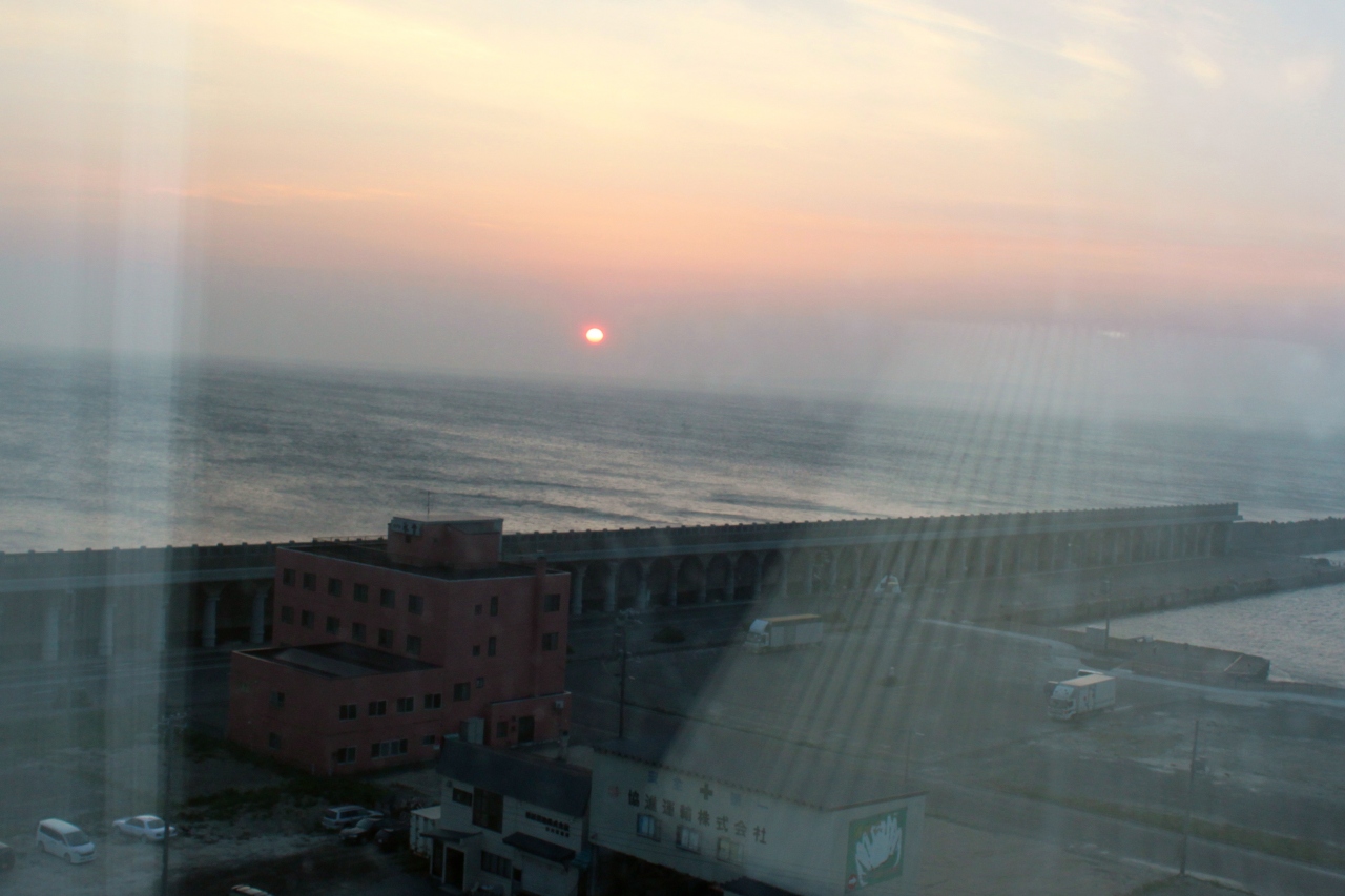 翌朝、泊まったホテルの窓から写真を撮ったら、朝日と共に写っていた。- 旅行時期