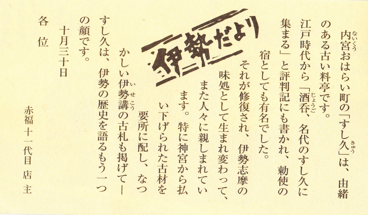 神宮をお参りしてから、こちらに流れてきて、入りました。私は初めてでしたが、名古屋在住の知人が下調べをすませてくれていて、ここならあまりまたされないと言うことで選んだようでした。入り口で名前を用紙に記入して貰って10分くらい待ったら呼ばれて案内されました。2階の大広間のような部屋で、座卓。