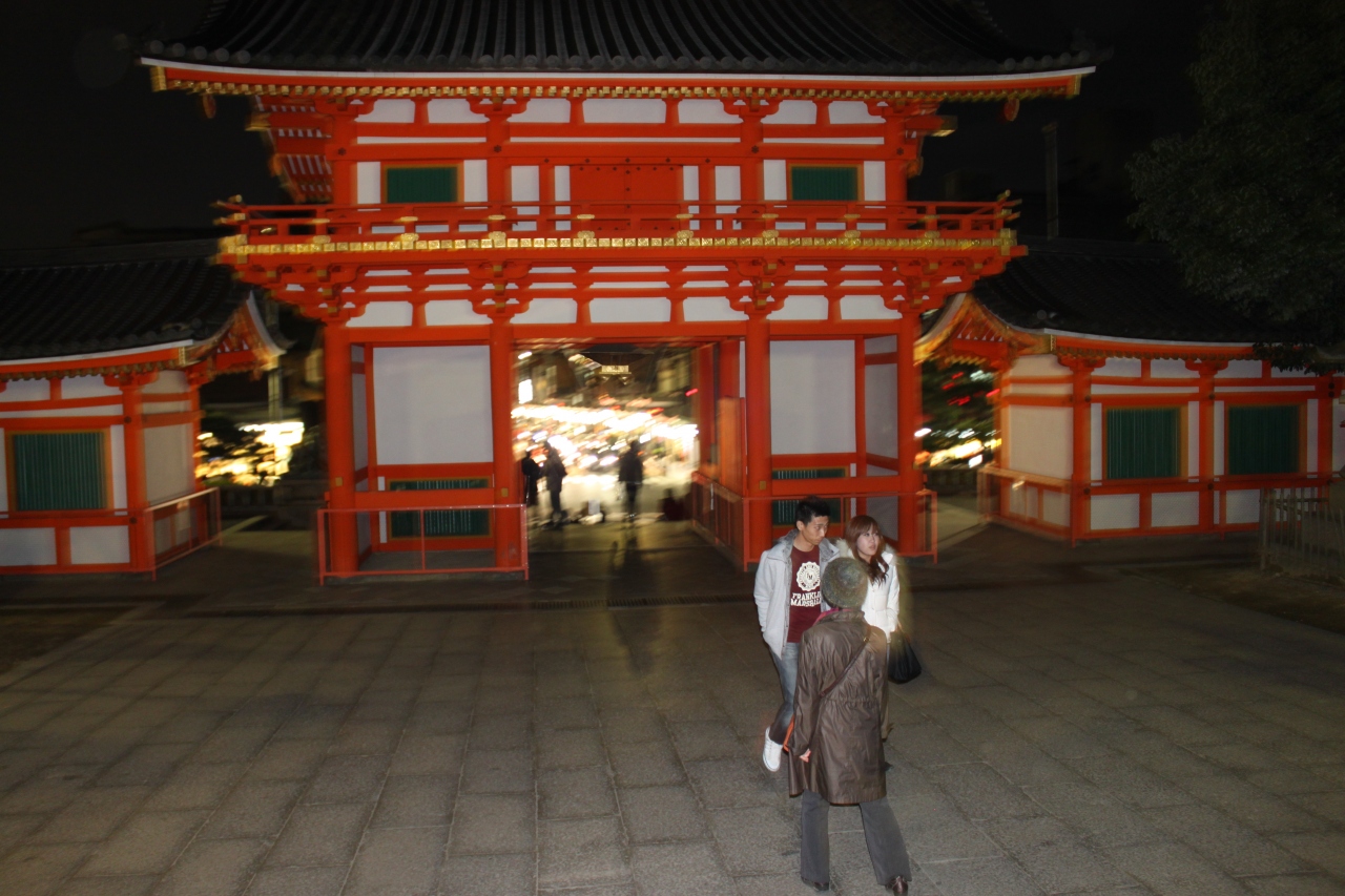 朱塗りの鳥居が目を引く京都のシンボル的存在。私の町にも八坂神社と名の付く神社があるが、それらの総本社である。便利な町中にあるので誰でもここを観光の目印にしたらわかりやすいだろう。あちこち歩き回り、日暮れてから訪ねたがそれでも結構な人が出ていた。