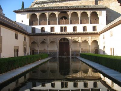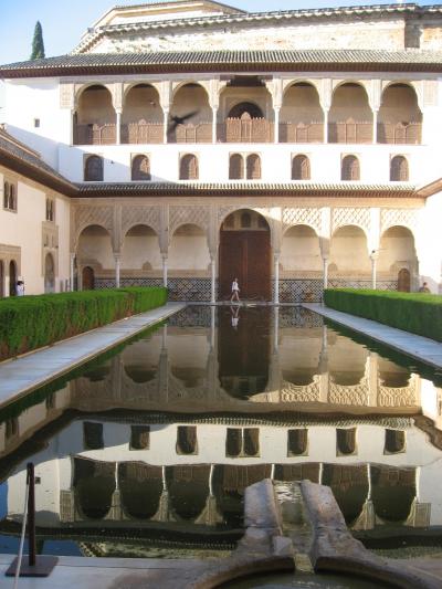 アルハンブラ宮殿の一番有名な場所かも知れない。多分名前は知らなくても旅のパンフレットや、ガイドブックなどで写真をよく見ていてお馴染みだろう。広いアルハンブラ宮殿の中の「ナスル宮殿」にある。まるでプールみたいな四角い池が真ん中に配され、その両側は生け垣が囲い、北側は「大使の間」南側は「カルロス五世宮殿」につながる。