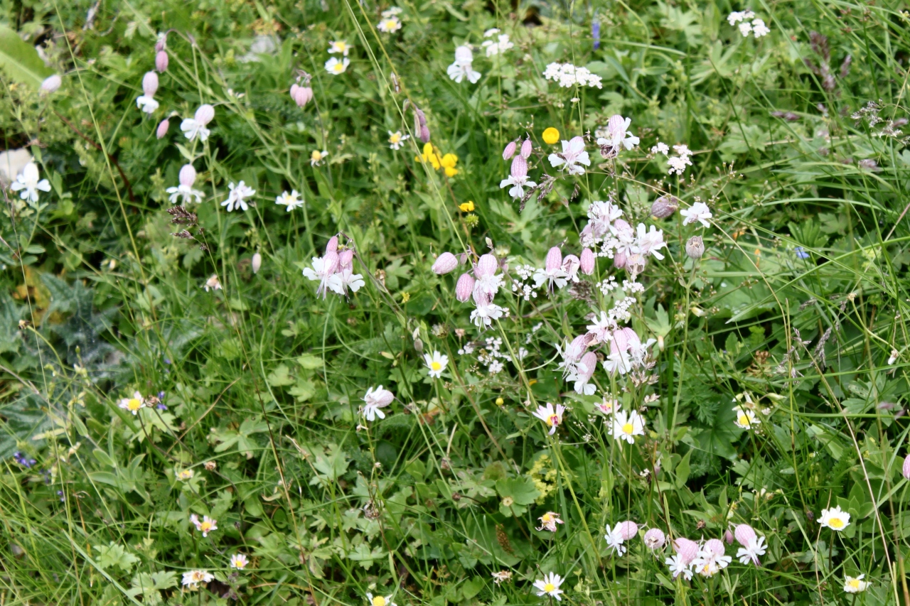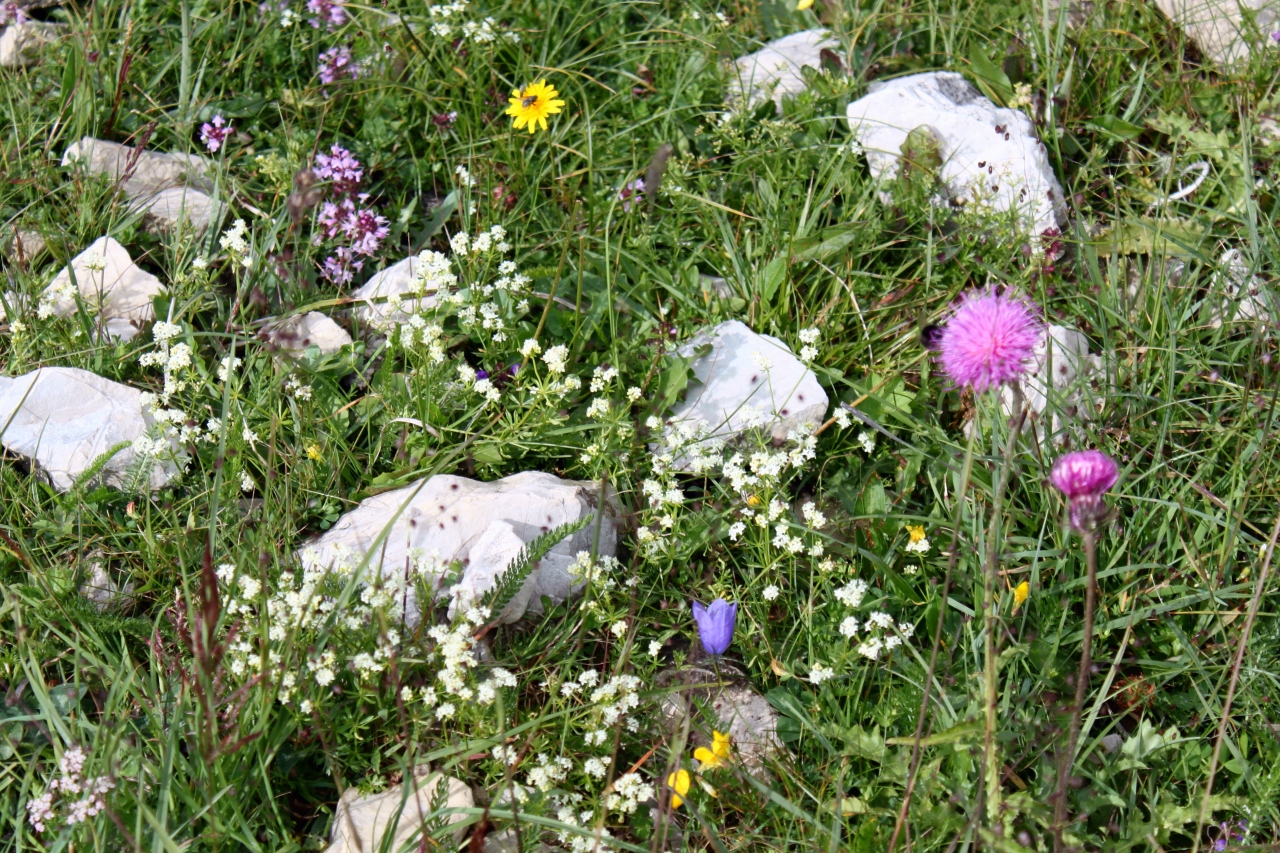 普通は展望台から又、戻りのゴンドラに乗って帰るのだが、私たちは歩いて降りることにした。広い道はないが細い遊歩道があって、登ってくる人もいた。かなりきつい斜面もあるが、途中チロルの花々をながめられたし、ゴンドラも見えたし、満足のチロルの山歩き体験になった。