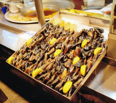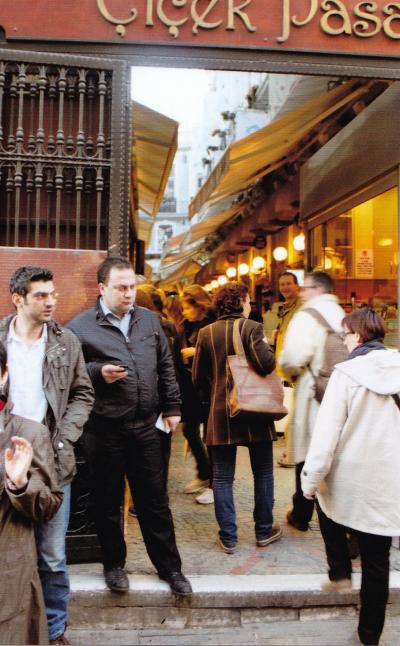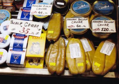 タキシム広場からイスクラル通りを南に歩いていくと、中ほど右側にチェチェッキパサージュという建物がある。入り口を入ると中は広いアーケードのレストラン街。両側にびっしり店が並ぶ中を歩いていくとその先にある。ただ普通の大きな魚市場を想像して行くとちょっと違う。店の数も多くない。カラスミ(蝋でかためてある)や、黒海のキャビア、乾物的な物を売る店や、海鮮総菜等を並べている店があった。